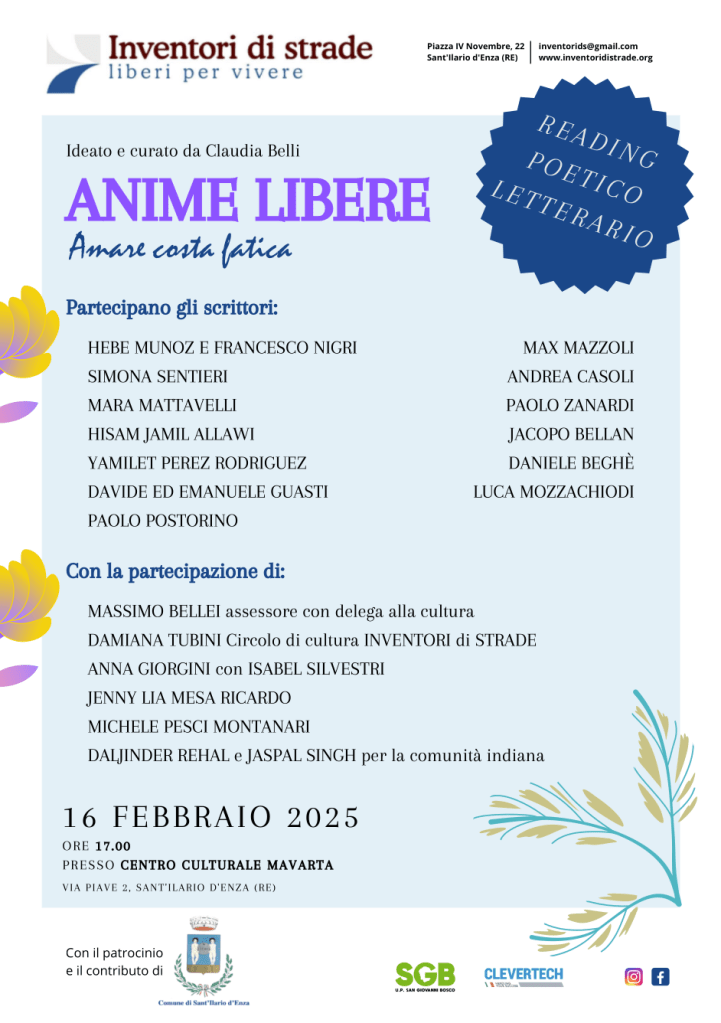 16 febbraio 2025: “ANIME LIBERE – Amare costa fatica” – Reading poetico letterario 10 febbraio 2025 ~ inventorids La locandina dell’evento in pdfDownload Condividi: Condividi su X (Si apre in una nuova finestra) X Condividi su Facebook (Si apre in una nuova finestra) Facebook Invia un link a un amico via e-mail (Si apre in una nuova finestra) E-mail Stampa (Si apre in una nuova finestra) Stampa Condividi su WhatsApp (Si apre in una nuova finestra) WhatsApp