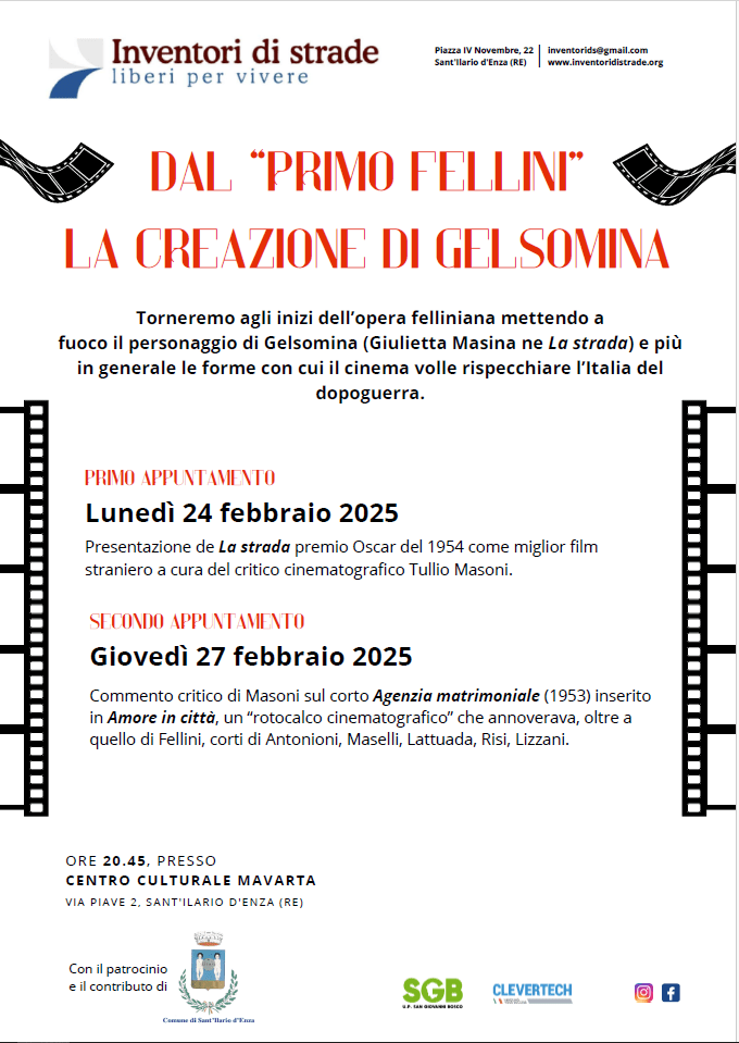 24 e 27 febbraio 2025: Dal “primo Fellini” la creazione di Gelsomina 12 febbraio 202514 febbraio 2025 ~ inventorids La locandina dell’evento in pdfDownload Condividi: Condividi su X (Si apre in una nuova finestra) X Condividi su Facebook (Si apre in una nuova finestra) Facebook Invia un link a un amico via e-mail (Si apre in una nuova finestra) E-mail Stampa (Si apre in una nuova finestra) Stampa Condividi su WhatsApp (Si apre in una nuova finestra) WhatsApp
