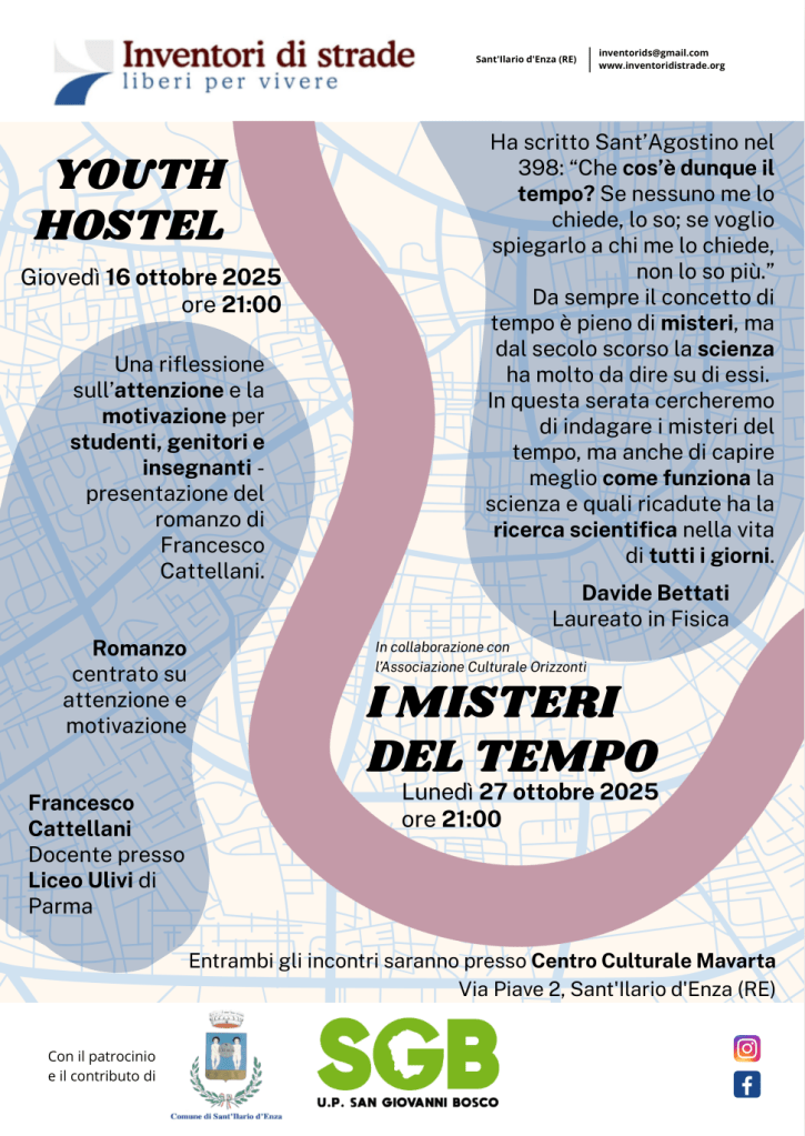16 e 27 ottobre 2025 ore 21: Youth Hostel con Francesco Cattellani / I misteri del tempo con Davide Bettati 2 ottobre 20252 ottobre 2025 ~ inventorids La locandina degli eventi in formato pdfDownload Youth Hostel sul sito web dell’editore Condividi: Condividi su X (Si apre in una nuova finestra) X Condividi su Facebook (Si apre in una nuova finestra) Facebook Invia un link a un amico via e-mail (Si apre in una nuova finestra) E-mail Stampa (Si apre in una nuova finestra) Stampa Condividi su WhatsApp (Si apre in una nuova finestra) WhatsApp