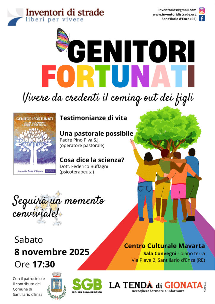 8 novembre 2025: “Genitori fortunati. Vivere da credenti il coming out dei figli” 29 ottobre 2025 ~ inventorids La locandina dell’evento in pdfDownload Condividi: Condividi su X (Si apre in una nuova finestra) X Condividi su Facebook (Si apre in una nuova finestra) Facebook Invia un link a un amico via e-mail (Si apre in una nuova finestra) E-mail Stampa (Si apre in una nuova finestra) Stampa Condividi su WhatsApp (Si apre in una nuova finestra) WhatsApp