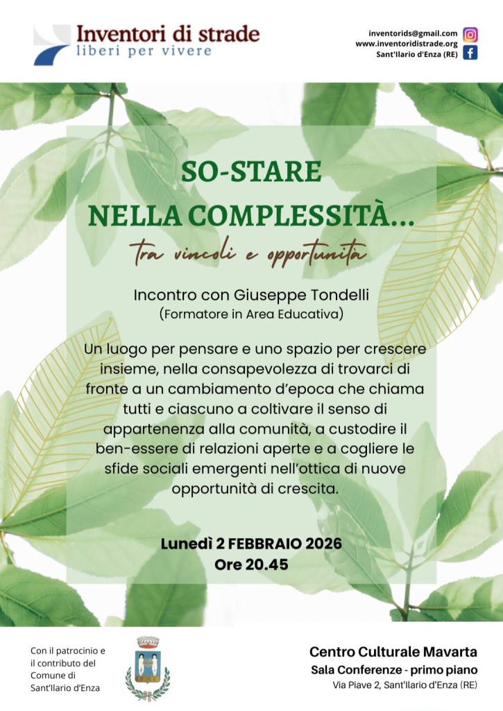 2 febbraio 2026: SO-STARE nella complessità … Incontro con Giuseppe Tondelli 20 gennaio 202620 gennaio 2026 ~ inventorids La locandina in formato pdfDownload Condividi: Condividi su X (Si apre in una nuova finestra) X Condividi su Facebook (Si apre in una nuova finestra) Facebook Invia un link a un amico via e-mail (Si apre in una nuova finestra) E-mail Stampa (Si apre in una nuova finestra) Stampa Condividi su WhatsApp (Si apre in una nuova finestra) WhatsApp