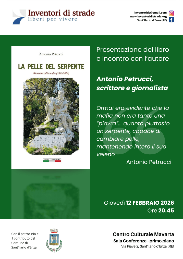 12 febbraio 2026: Presentazione del libro “La pelle del serpente” e incontro con l’autore Antonio Petrucci 3 febbraio 2026 ~ inventorids La locandina in formato pdfDownload Condividi: Condividi su X (Si apre in una nuova finestra) X Condividi su Facebook (Si apre in una nuova finestra) Facebook Invia un link a un amico via e-mail (Si apre in una nuova finestra) E-mail Stampa (Si apre in una nuova finestra) Stampa Condividi su WhatsApp (Si apre in una nuova finestra) WhatsApp