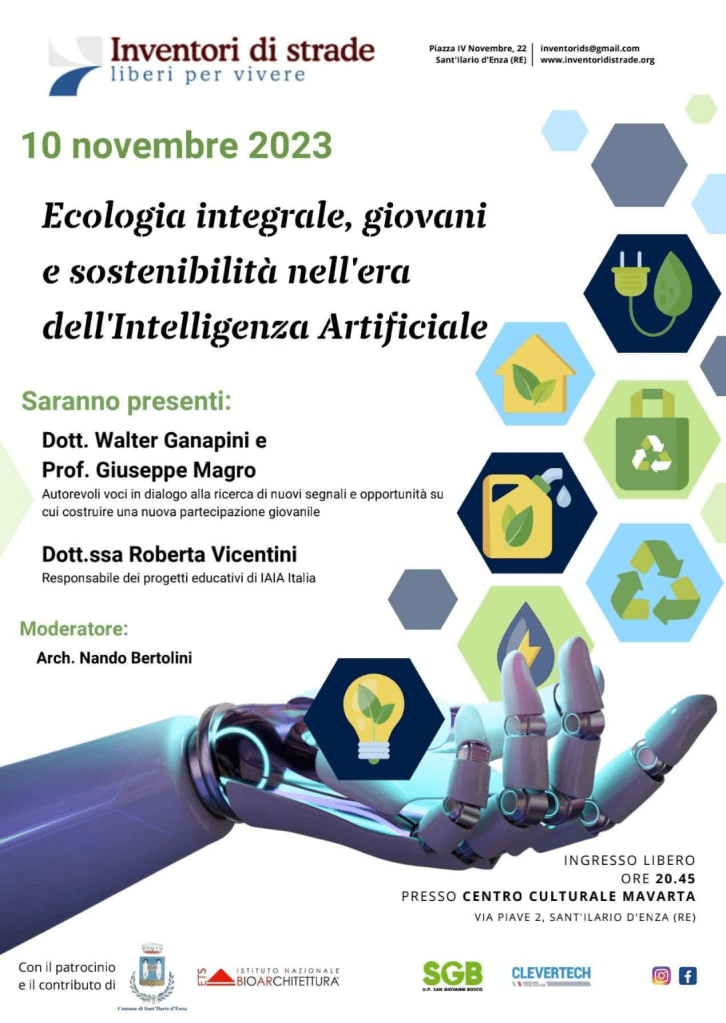 “Ecologia integrale, giovani e sostenibilità nell’era dell’Intelligenza Artificiale“. Questo il titolo dell’incontro che si terrà a S. Ilario d’Enza venerdì 10 novembre 2023 (ore 20,45) presso Centro Culturale Mavarta (Via Piave, 2). Si parlerà dell’impatto dell’Intelligenza Artificiale (IA) in relazione alle sfide epocali che ci attendono, del ruolo delle giovani generazioni nel cercare nuove forme di dialogo inter-generazionale e della necessità di realizzare la transizione ecologico-digitale senza alterare i delicati equilibri sociali ed economici, a livello locale e su scala globale. Verranno esplorati i legami tra l’Ecologia integrale e l’IA, i rischi latenti di una tecnologia senza precedenti e le opportunità straordinarie di orientarne l’impiego verso il benessere collettivo. L’obiettivo è dare ai giovani la possibilità di utilizzarne il potenziale per progettare in modo condiviso nuove forme di governance e di poterne concretamente migliorare il livello di sostenibilità.