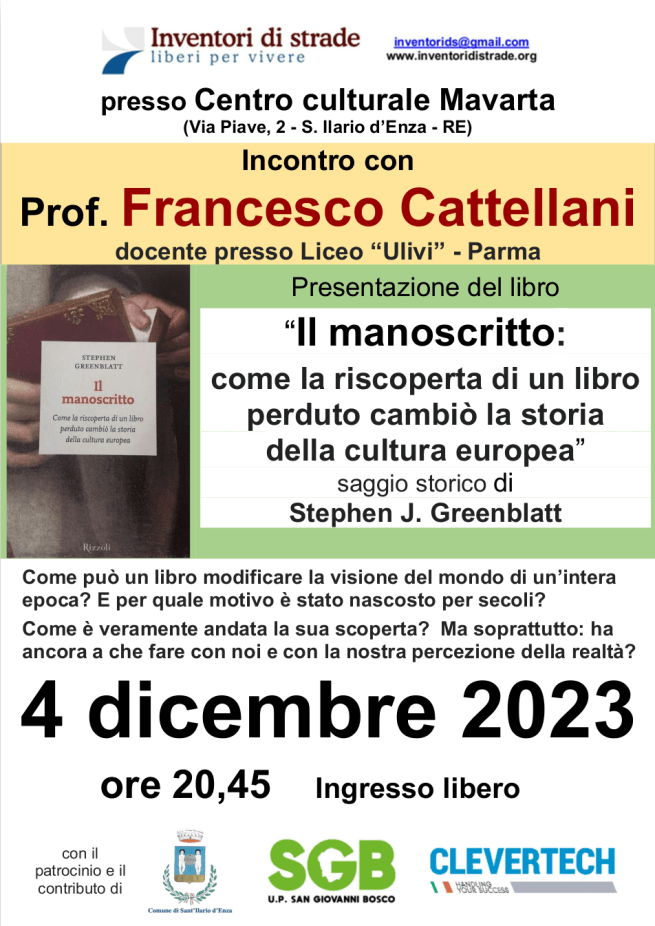 Francesco Cattellani presenta il libro “Il manoscritto: come la riscoperta di un libro perduto cambiò la storia della cultura europea”. - Giovedì 14 dicembre ore 20:45 presso centro Mavarta, Via Piave 2