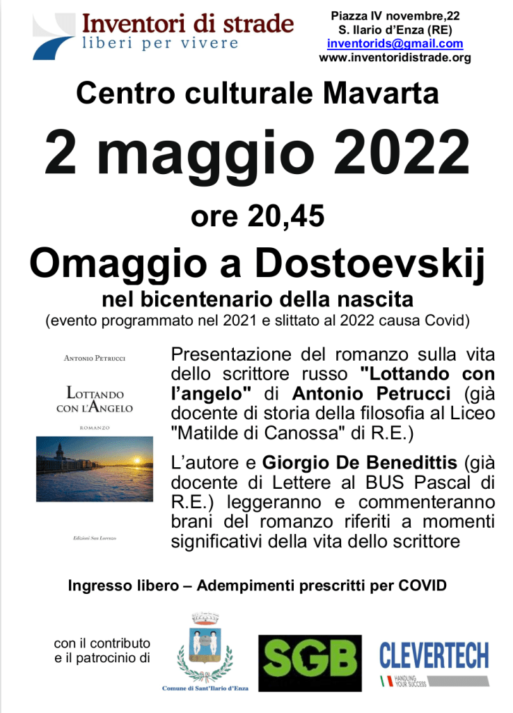 Lunedì 2 maggio 2022 alle ore 20,45 presso il Centro Culturale Mavarta di Sant’Ilario d’Enza (RE) proseguiranno le attività 2021/2022 del Circolo di Cultura Inventori di Strade con l’incontro con Antonio Petrucci e Giorgio De Benedittis.