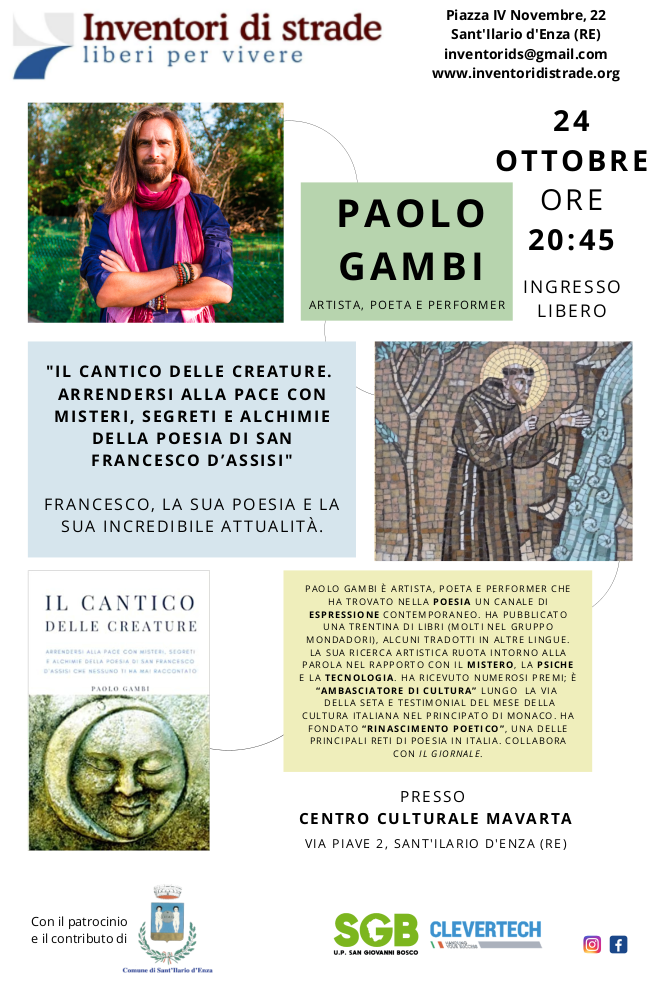 - 24.10 Paolo Gambi, artista, poeta e performer: “Il cantico delle creature. Arrendersi alla pace con misteri, segreti e alchimie della poesia di San Francesco d’Assisi”. Francesco, la sua poesia e la sua incredibile attualità.