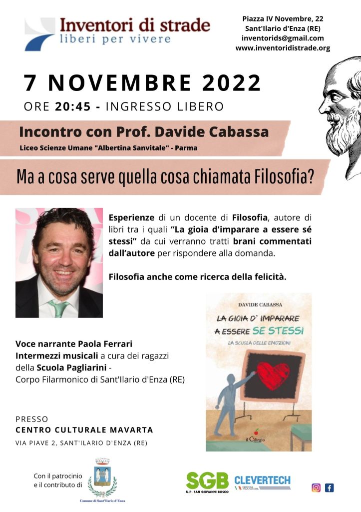 - 7.11 Prof. Davide Cabassa, Liceo Scienze Umane “Albertina Sanvitale”, Parma: “Ma a cosa serve quella cosa chiamata Filosofia?”, con intermezzi musicali. Esperienze di un docente di Filosofia, autore di libri quali “La rabbia e la gioia d’insegnare – La gioia d’imparare a essere sé stessi”.