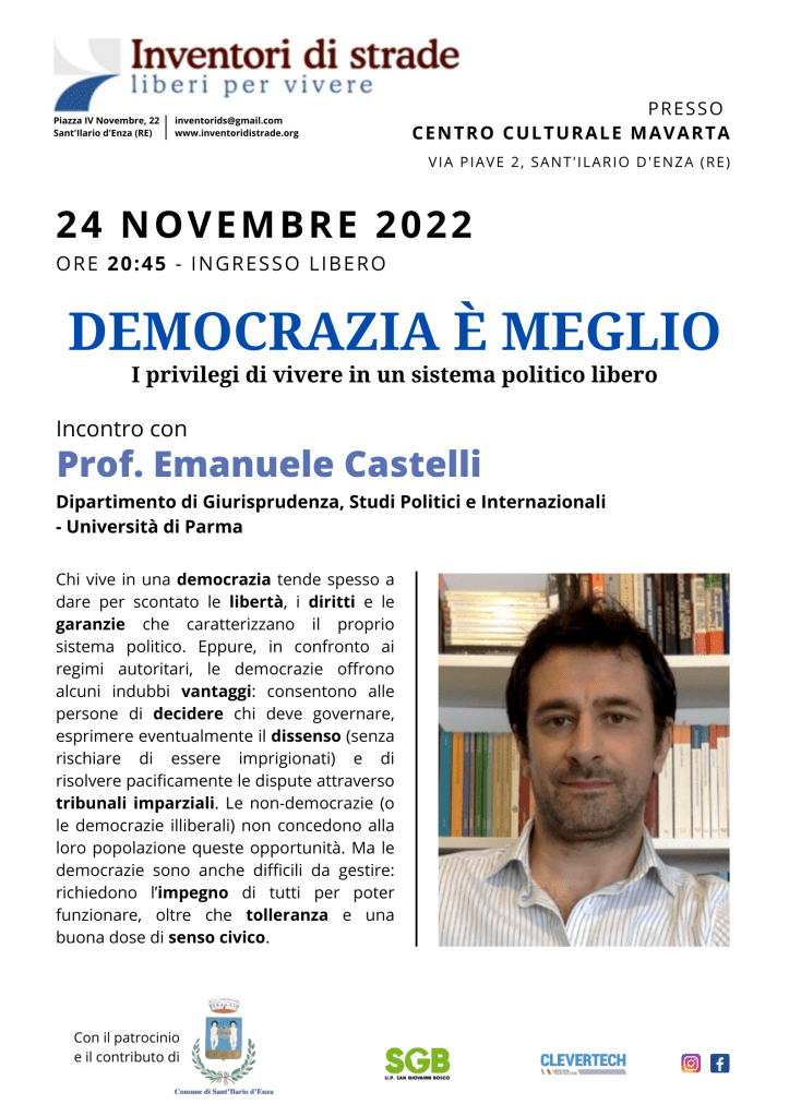 - 24.11 Prof. Emanuele Castelli: Dipartimento di Giurisprudenza, Studi Politici e Internazionali, Università di Parma: “Democrazia è meglio. I privilegi di vivere in un sistema politico libero”.